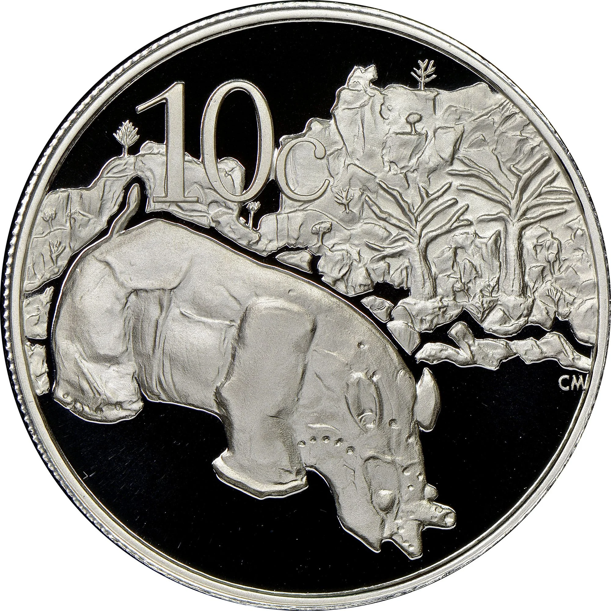 Golden Rhino before Mapungubwe Hill and trees, with denomination below and designer's initials at left.