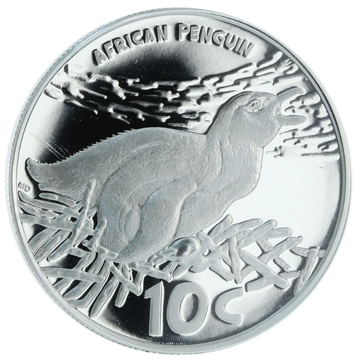 African penguin chick in nest, ocean behind. Legend above, initials left, denomination below.