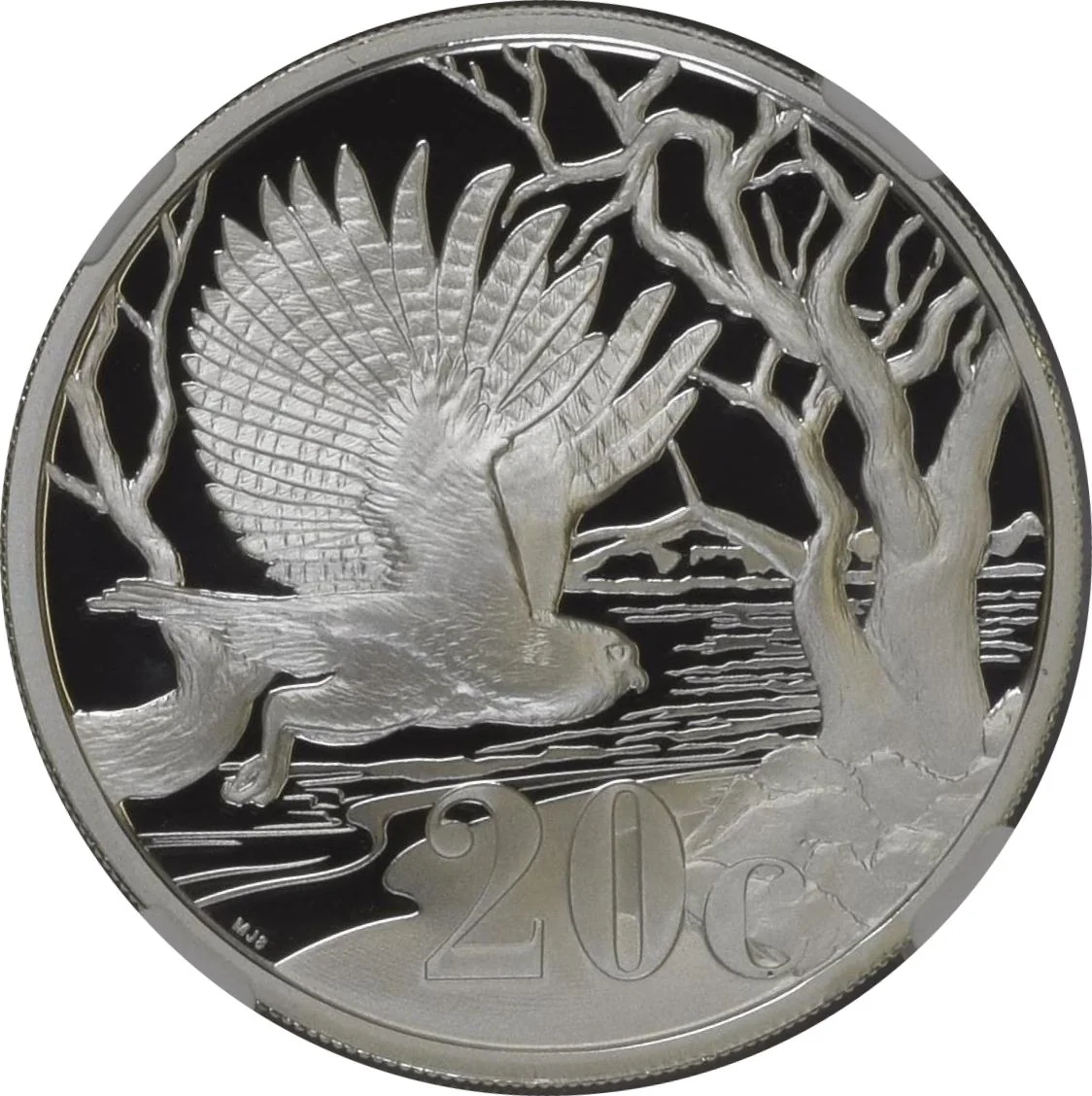 Pel's Fishing Owl flying left amid dry trees, water behind. Designer initials lower left, denomination below owl.
