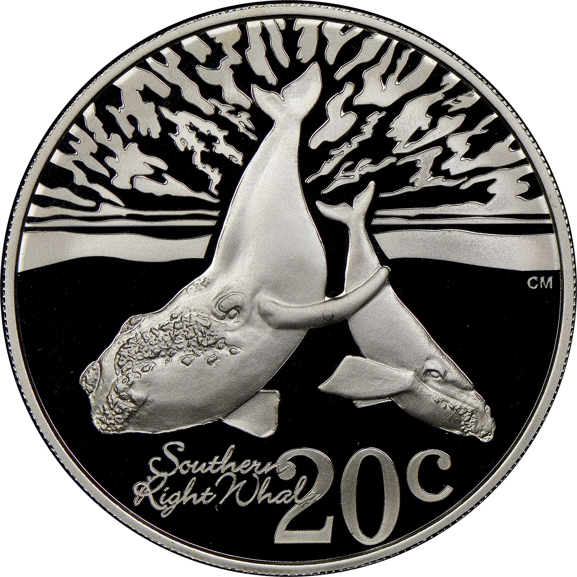 Southern Right Whale and calf diving. Designer initials on right rim. Denomination and legend below.