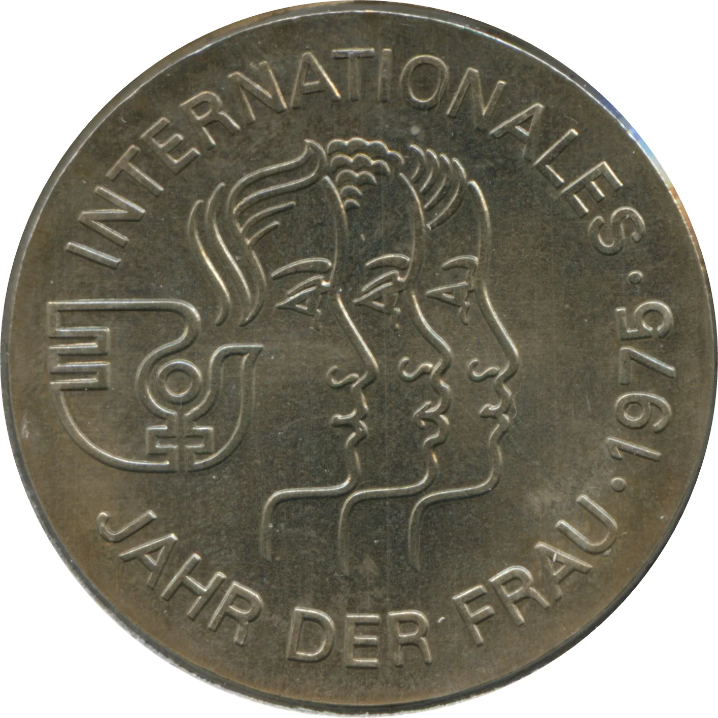Three women's profiles with the International Year of Women symbol.