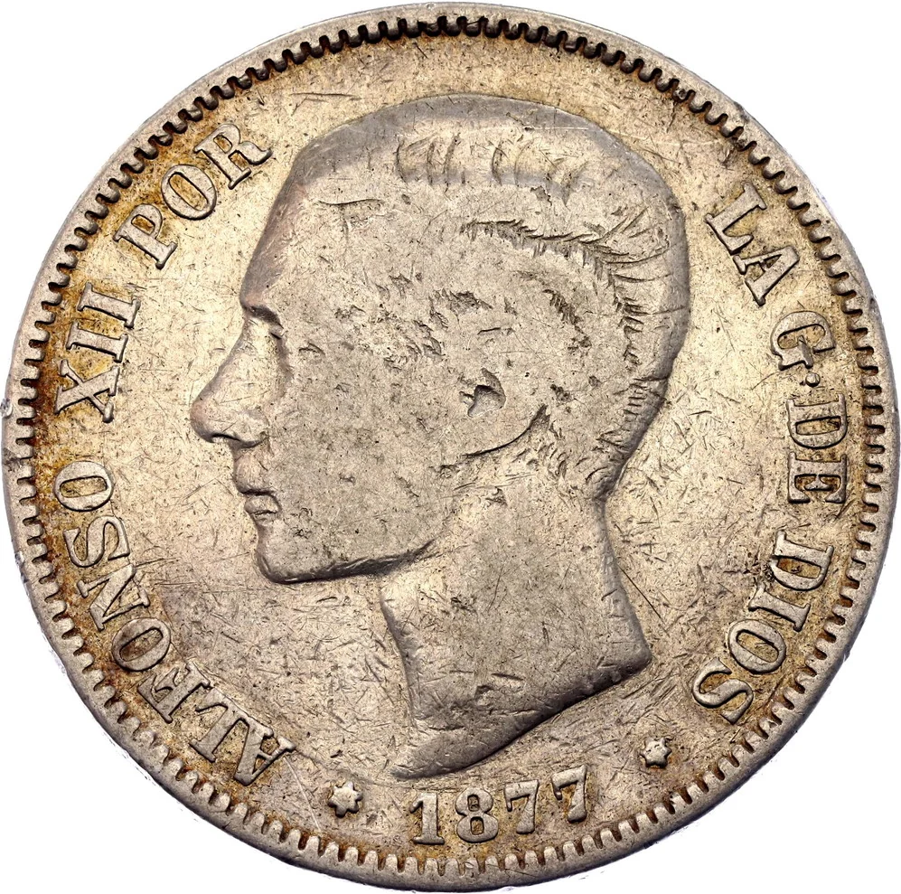 In 1877, Spain was navigating the complex aftermath of the Glorious Revolution of 1868 and the subsequent establishment of the First Spanish Republic (1873-1874), which had recently collapsed with the Bourbon Restoration in 1874. The monetary system was in a state of disarray and transition. The revolutionary government had decimalized the currency in 1868, introducing the peseta as the sole national currency to replace the old, chaotic system of reales, escudos, and duros. However, by 1877, the peseta was still consolidating its position, facing public skepticism and competition from older, familiar coins that remained in circulation.