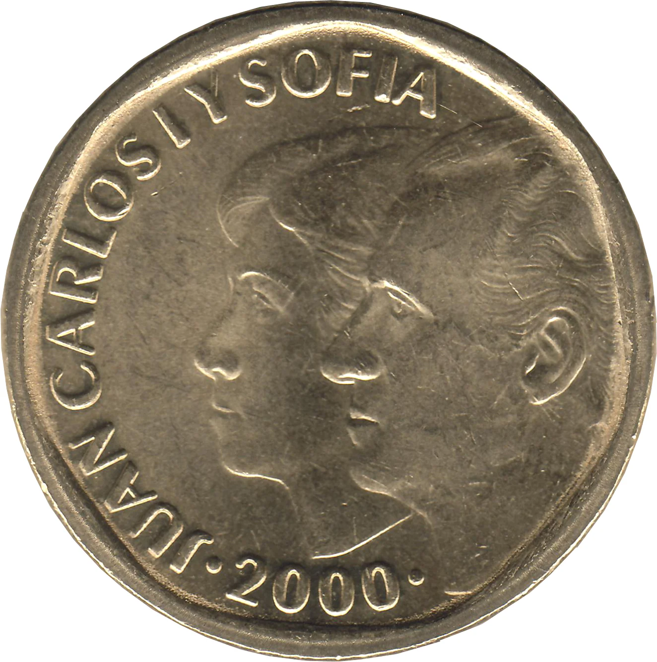 Conjoined heads of King Juan Carlos I and Queen Sofía, facing left.