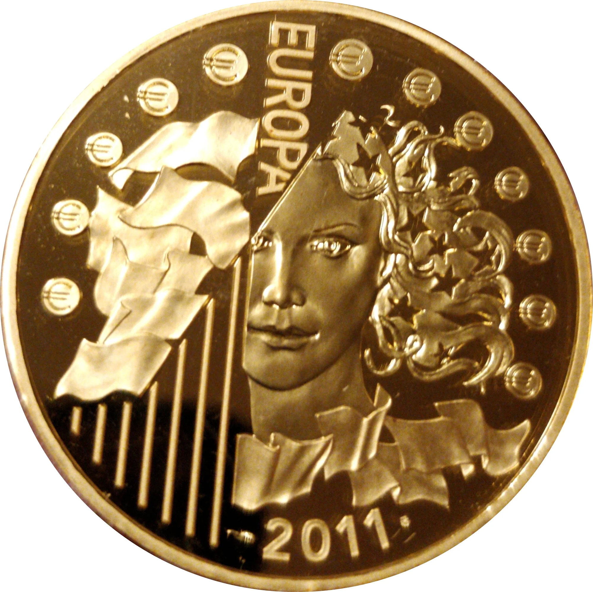 Portrait of Europa with stars in her hair, above an arc of 12 "€" symbols. To her left, European flags on mats.
