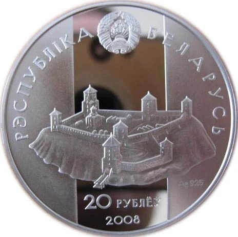 Description: Obverse: Relief of the State Coat of Arms with the inscription "РЭСПУБЛІКА БЕЛАРУСЬ". Center: Reconstruction of the ancient Novogrudok castle. Below: Denomination "20 РУБЛЁЎ", year of issue, and alloy standard.