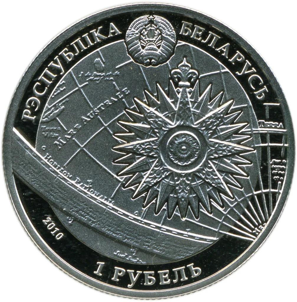 Description: Featuring the relief of the State Coat of Arms and РЭСПУБЛIКА БЕЛАРУСЬ above, a stylized wind rose on a navigation chart in the center, and 1 РУБЕЛЬ with the year of issue below.