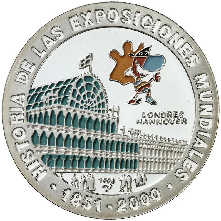 Twipsy mascot atop the 1851 London Expo building. Circular legend with name and dates. Exposition cities on right; mintmark and issue date above dates.