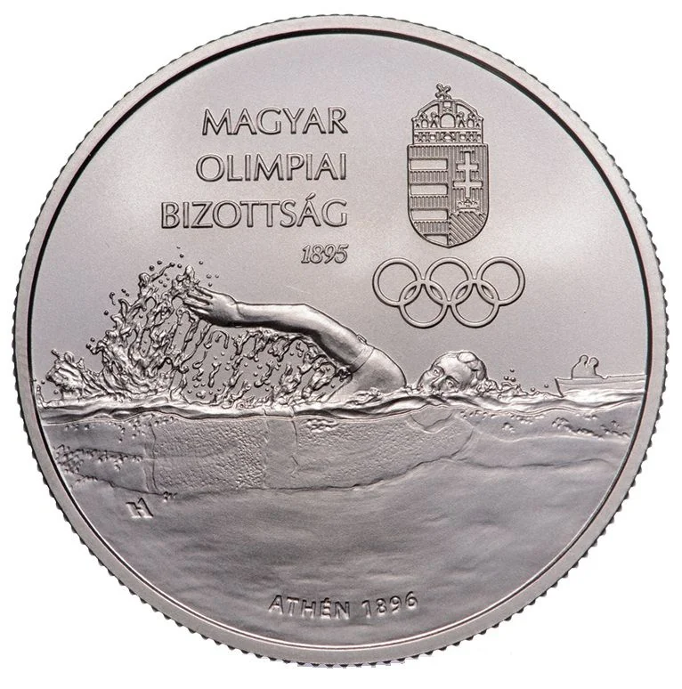 Competitive swimmer with Olympic rings and Hungarian crest above.