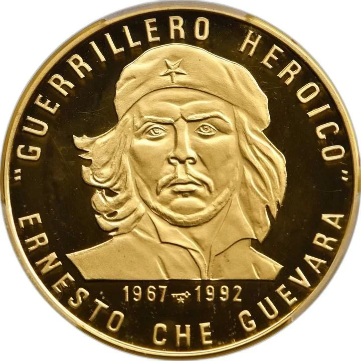 Portrait of Che Guevara "Guerrillero Heroico" with circular legend, dates and mintmark below.