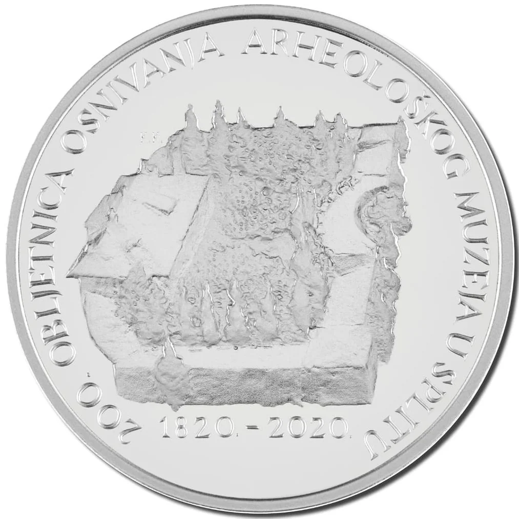 The central commemorative silver coin depicts the Archaeological Museum in Split complex: the museum building with its spacious porch, enclosed by a high wall and surrounded by a garden of Mediterranean conifers. Circling the edge is the inscription "200. ANNIVERSARY OF THE ESTABLISHMENT OF THE ARCHAEOLOGICAL MUSEUM IN SPLIT," with "1820. - 2020." below the building.