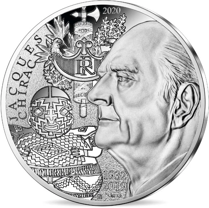 The coin features Jacques Chirac alongside symbols of his career: the French Republic's emblem, representing his presidency, and the Quai Branly Museum's Chupicuaro statuette, reflecting his investment and passion for Primitive Arts.