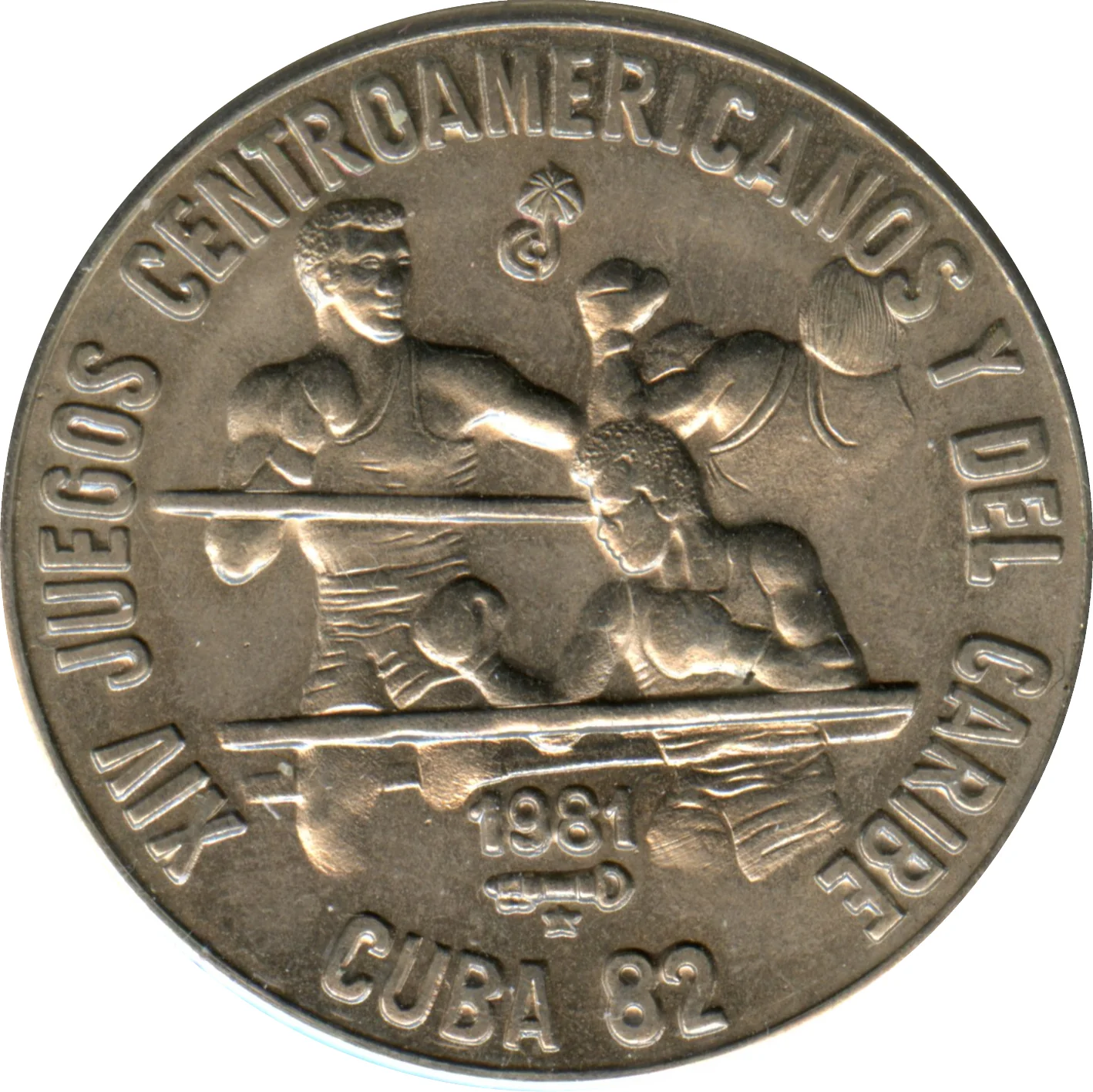 Three boxers on coin. Event name in circular legend above, date and place below. Mintmark and issue date beneath image.