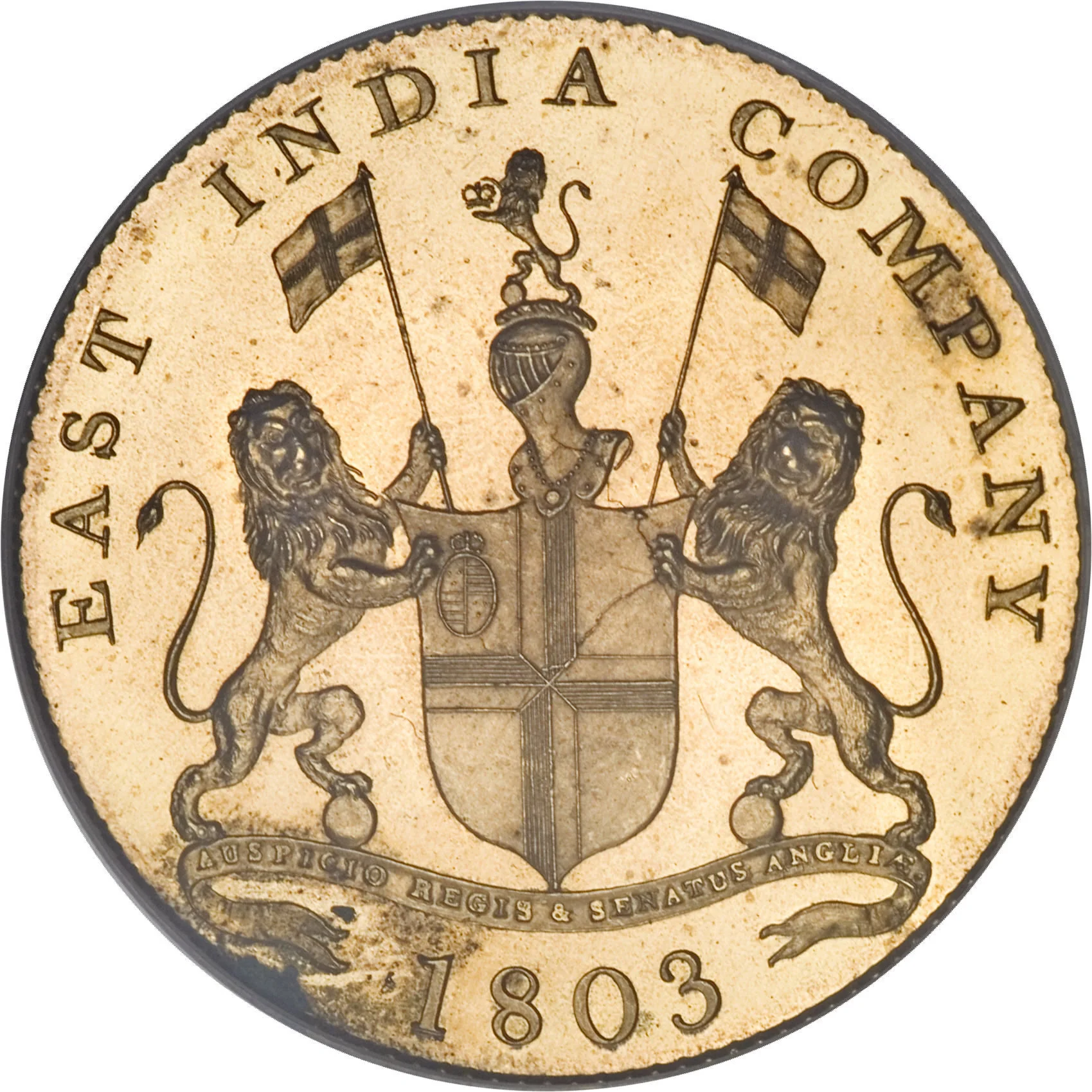 East India Company coat of arms: Two lions, crest and flags with St George's cross, ribbon motto "Auspicio Regis et Senatus Anglia," date beneath.