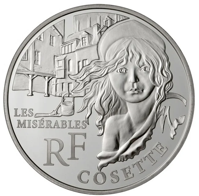 Cosette's face, with a well and house behind. Inscriptions: "LES MISÉRABLES", "RF", and "COSETTE".