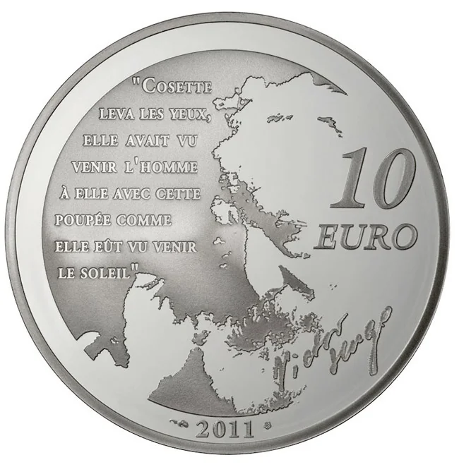 Victor Hugo's portrait beside text from "Les Misérables." On the right, "10 EURO." Below, the issue year.