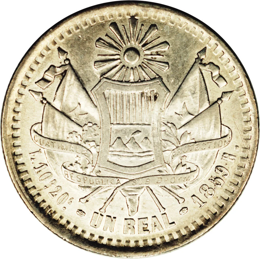In 1859, Guatemala’s currency system was a complex and unstable mixture of foreign and domestic coins, reflecting the economic and political turbulence following independence from Spain in 1821. The official currency was the Guatemalan Peso, but the economy relied heavily on the circulation of Spanish colonial coins, particularly silver reales, as well as coins from other nations like Mexico, Peru, and Great Britain. This multiplicity created significant confusion in trade and daily transactions, as the value of coins depended not only on their metallic content but also on their origin and wear, leading to frequent disputes and inefficiency.