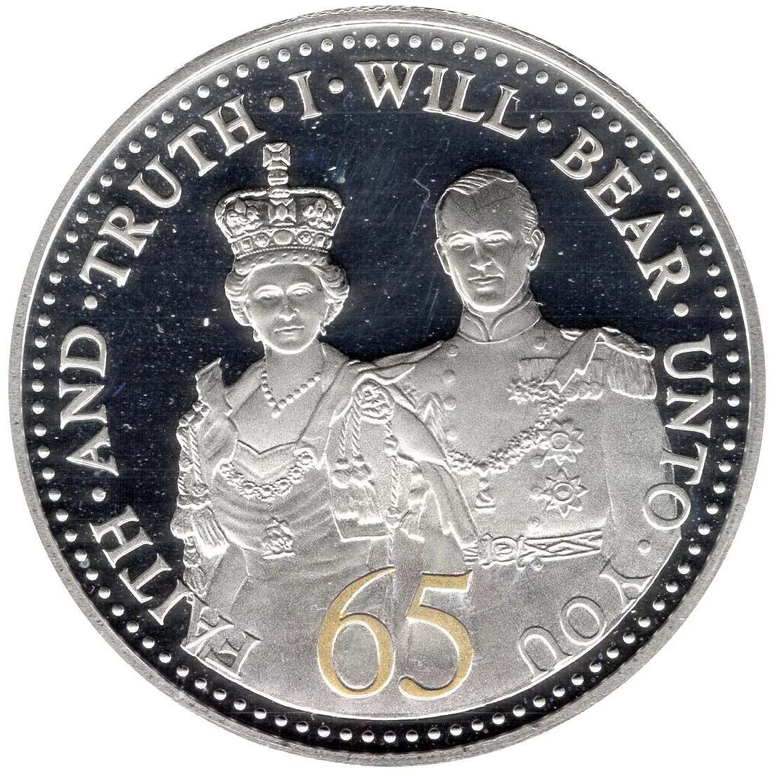 Queen Elizabeth II and Prince Philip, gold "65" below.