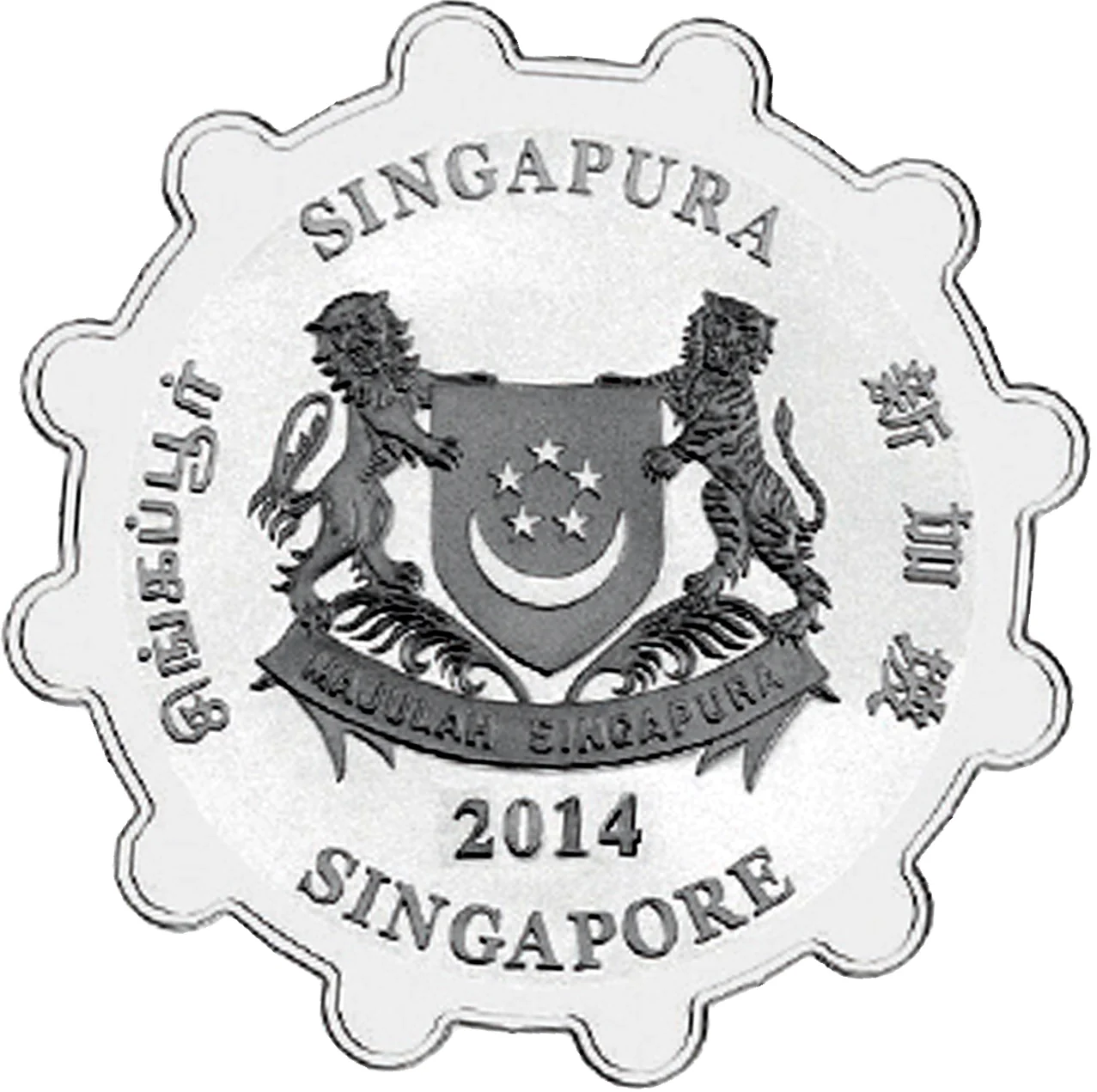 Emblem with date; 'Singapore' encircles it in English, Tamil, Chinese, and Malay.