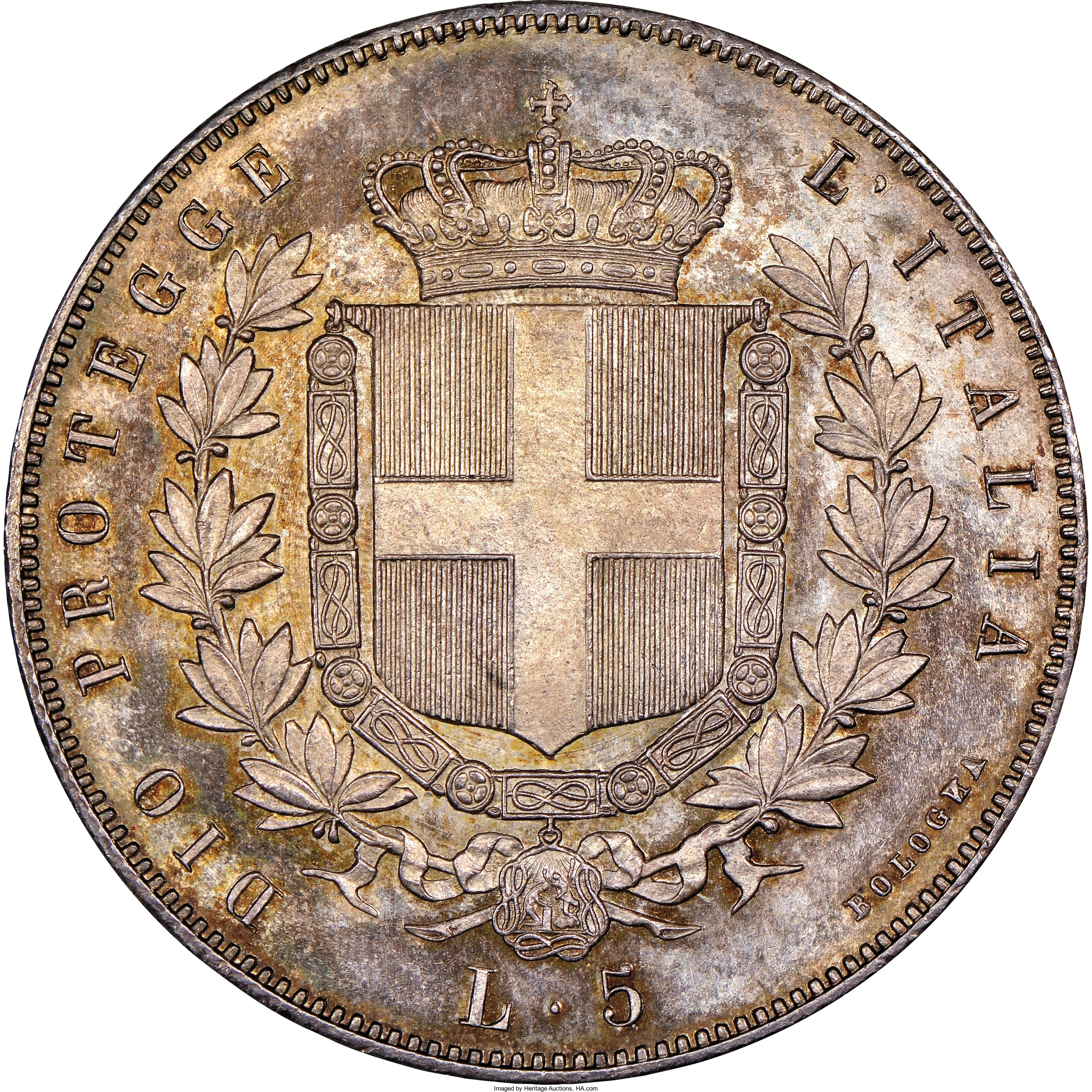 Crowned Savoy shield with collar, laurel wreath, and L.5 value; mintmark at lower right.