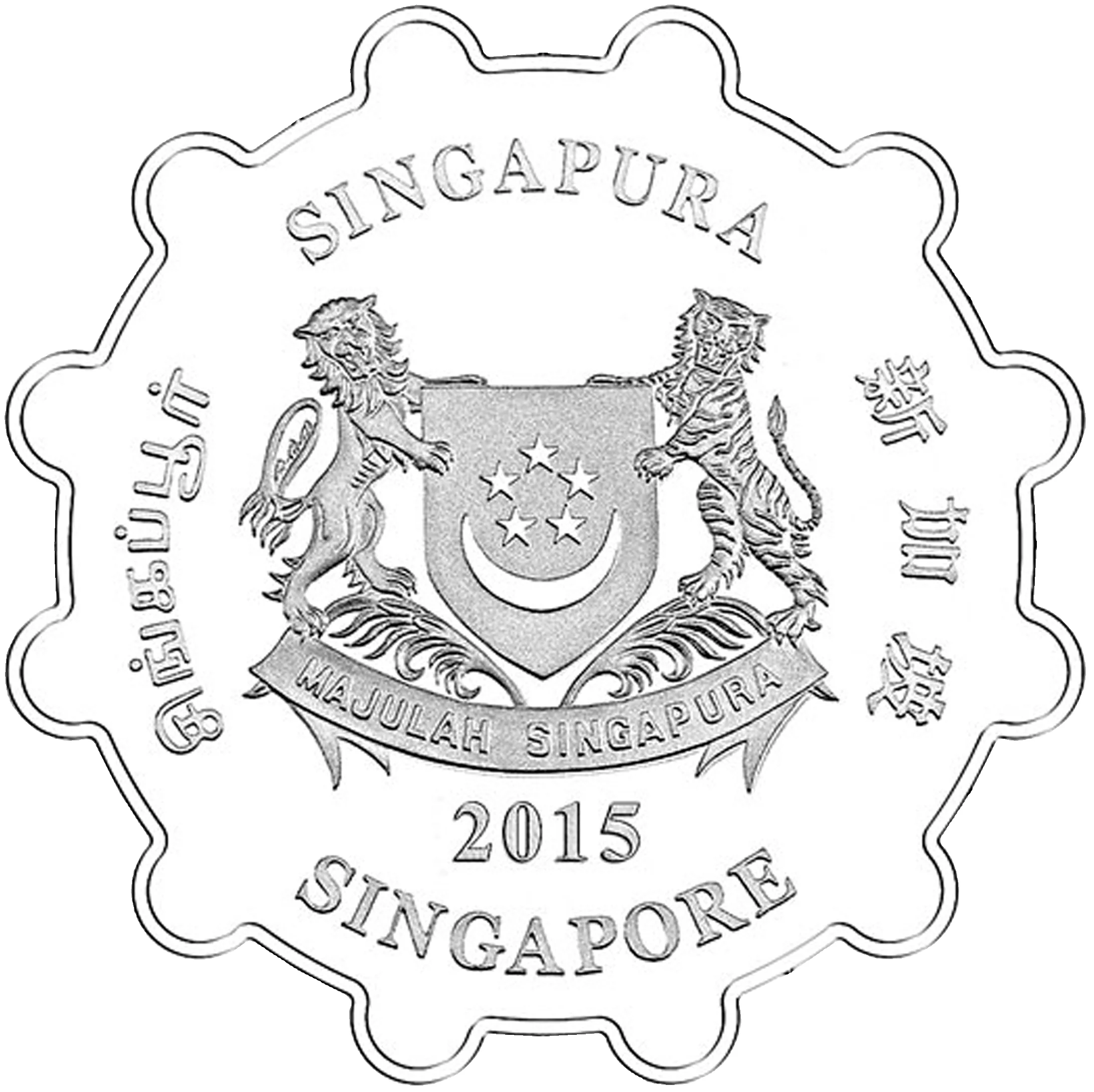 Emblem with date; 'Singapore' encircles it in English, Tamil, Chinese, and Malay.