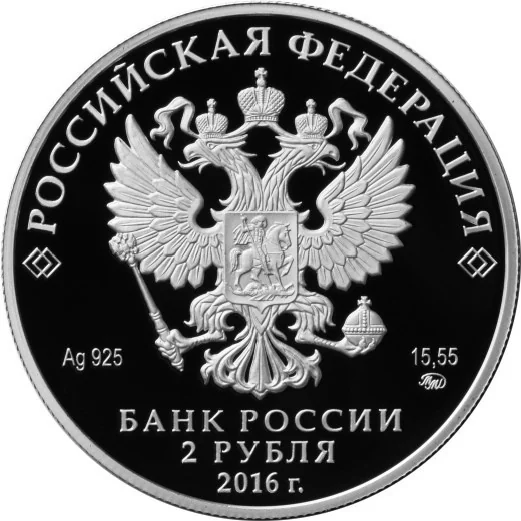 The obverse features the relief National Coat of Arms of the Russian Federation. Above it, a semicircular inscription reads "РОССИЙСКАЯ ФЕДЕРАЦИЯ", flanked by doubled rhombuses. Below the coat of arms are the metal specification and mint mark. At the bottom, in three lines, are the inscriptions: "БАНК РОССИИ", "2 РУБЛЯ", and "2016 г.".