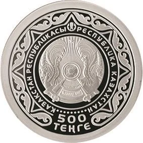 Description: The coat of arms of Kazakhstan is framed by inscriptions of the country's name in Kazakh ("ҚАЗАҚСТАН РЕСПУБЛИКАСЫ") and Russian ("РЕСПУБЛИКА КАЗАХСТАН"), along with national ornamentation. The denomination "500 ТЕҢГЕ" is at the bottom, and the logo of the National Bank of Kazakhstan is at the top.