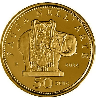 The Bernini elephant in Rome’s Piazza della Minerva, sculpted to support an ancient obelisk. Mintmark and date are at its sides, value below.