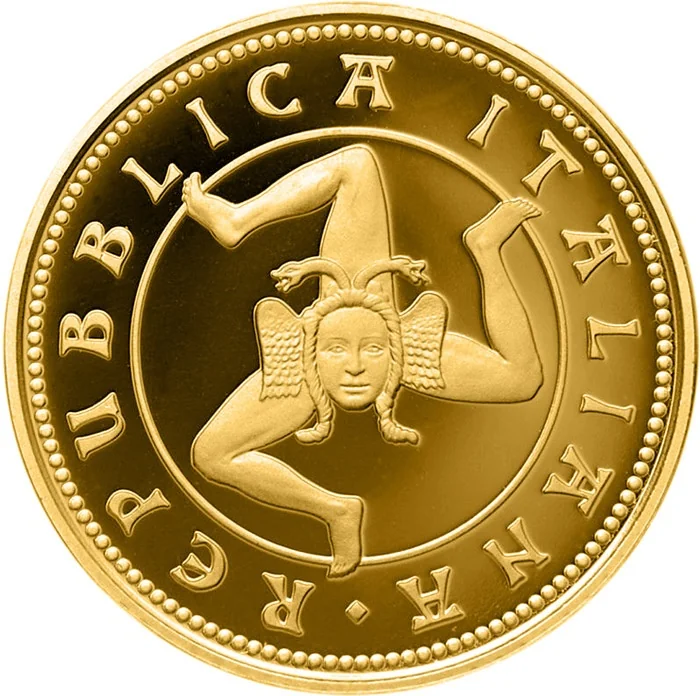 Inside a circle, the Trinacria (symbol of Sicily): a Gorgon's head with snake hair and three bent legs. Gothic legend encircles it.
