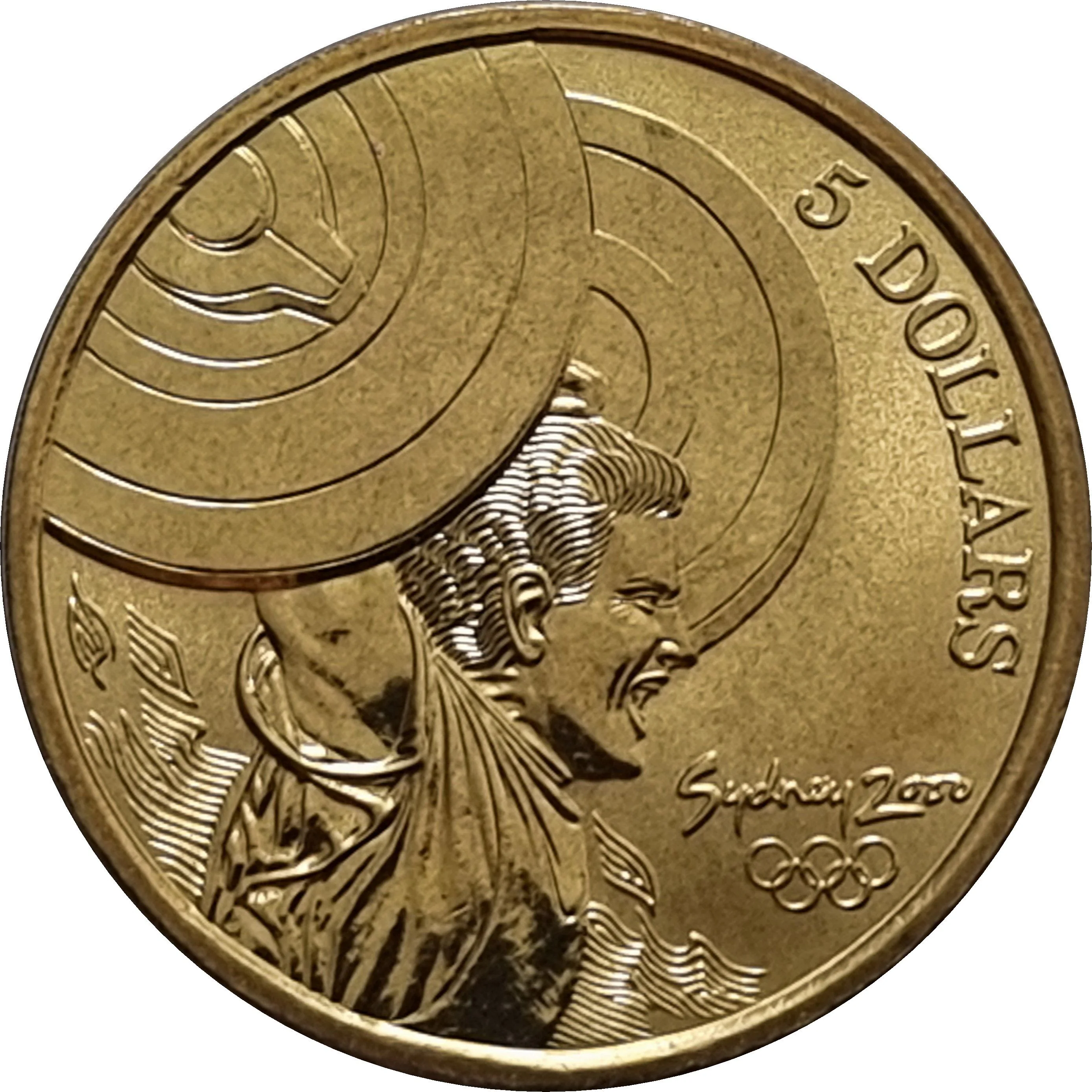 Weightlifter holding weights aloft, with Sydney 2000 Olympic rings below.