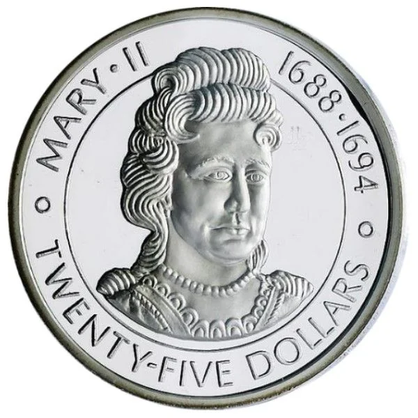 Portrait of Queen Mary II: three-quarter face, dates above, value below.