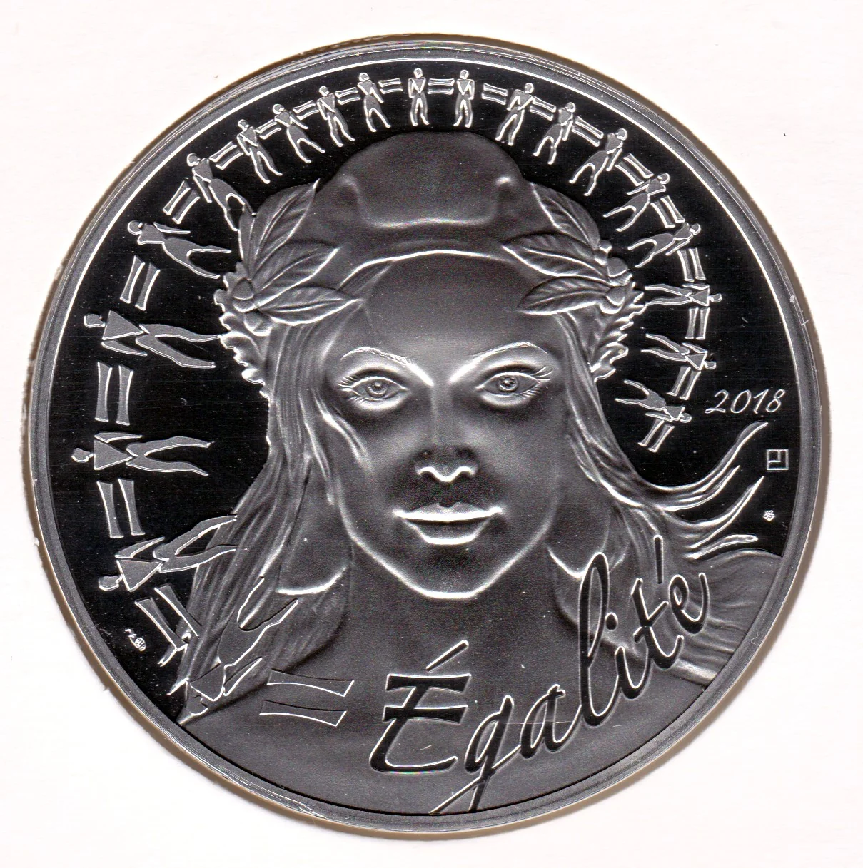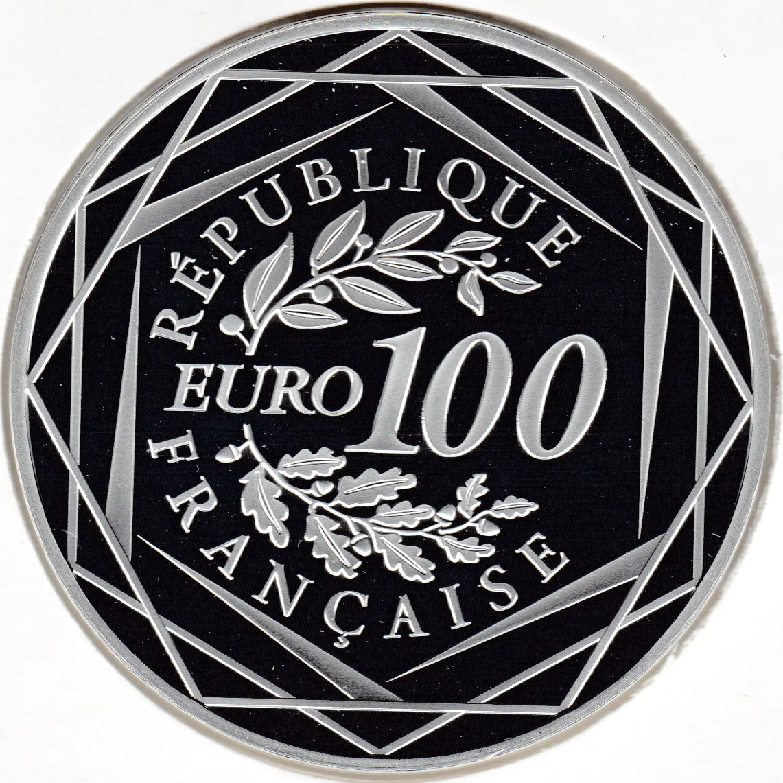 A laurel and oak branch flank the face value, encircled by the French motto and three hexagons.