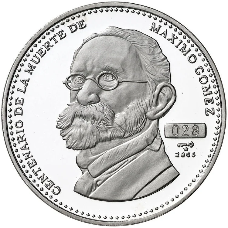 Description: Bust of Maximo Gomez left, with circular legend. Right rectangle shows individual coin number ("001"–"100"); date at lower right.