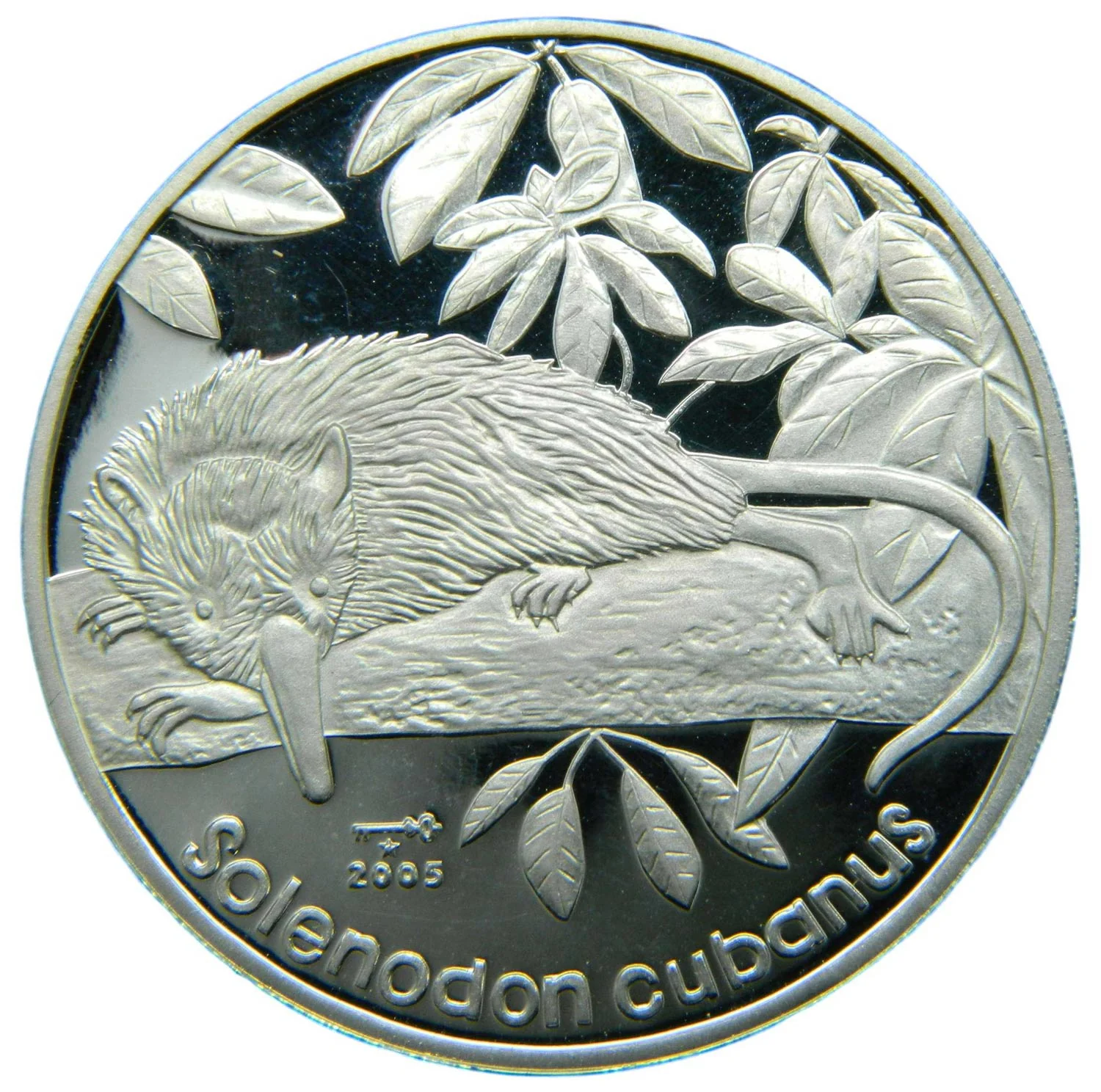 Cuban solenodon on branch, mintmark and date above, curved name below.