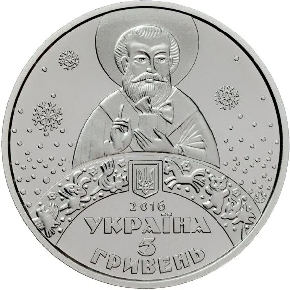 The obverse features a traditional St. Nicholas image above a rainbow with toys, Ukraine's small coat of arms, the year 2016, the inscriptions "УКРАЇНА" and "5 ГРИВЕНЬ," and the NBU mint mark.
