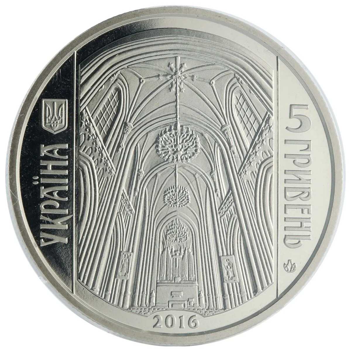 Left: Ukraine's small coat of arms and "УКРАЇНА". Center: the cathedral's interior. Right: face value "5 ГРИВЕНЬ" and the mint mark. Below: the year 2016.