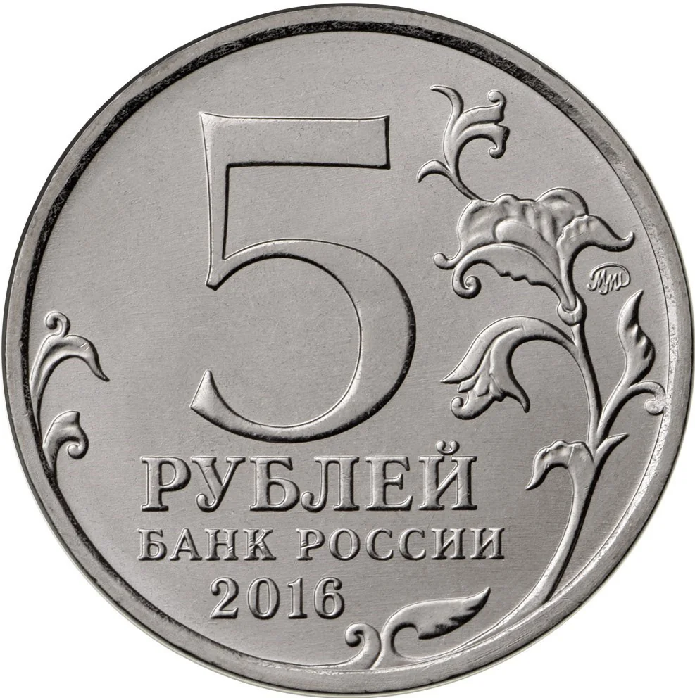 Face value "5 РУБЛЕЙ" in the center, with "БАНК РОССИИ" and "2016" below. Stylized plant branches flank the sides, and a Mint mark is on the right.