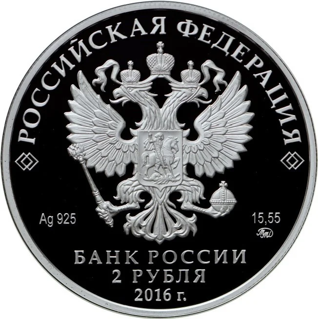 State Coat of Arms of the Russian Federation. Inscriptions: "РОССИЙСКАЯ ФЕДЕРАЦИЯ", "БАНК РОССИИ", "2 РУБЛЯ", 2016, metal designation, purity, mint mark, and fine metal content.