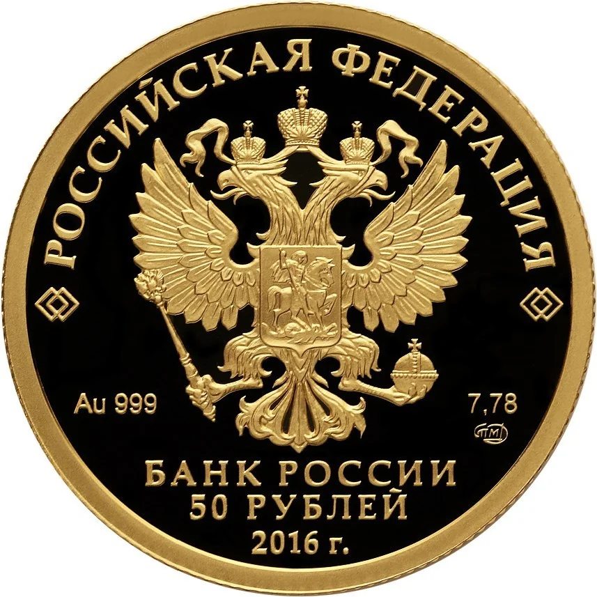 The State Coat of Arms of the Russian Federation in relief. Inscriptions: "РОССИЙСКАЯ ФЕДЕРАЦИЯ", "БАНК РОССИИ", "50 РУБЛЕЙ", "2016", metal designation, purity, the Saint Petersburg mint mark, and fine metal content.