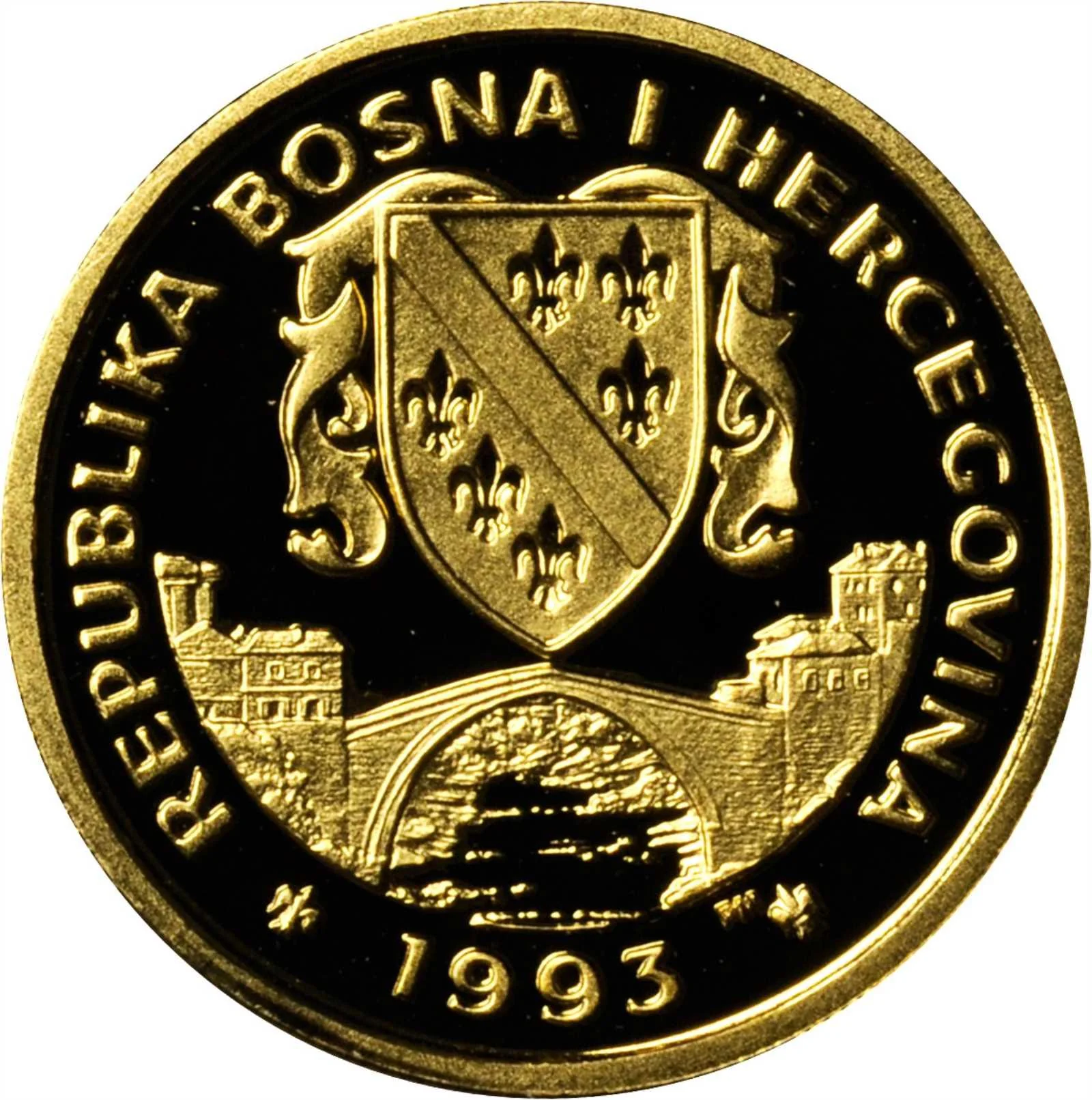 Bosnian emblem above Mostar Bridge; mintmark below bridge, right of date.