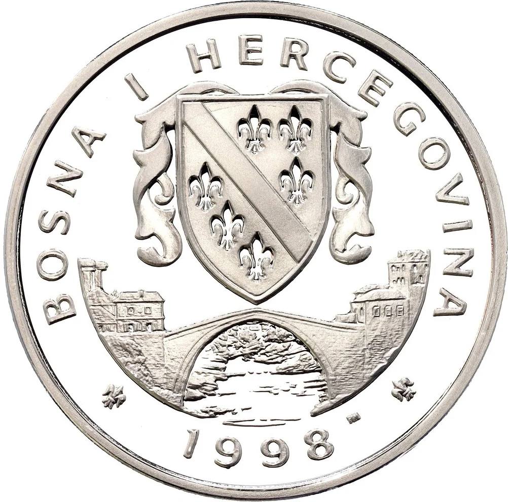 Bosnian emblem above Mostar Bridge; mintmark below bridge, right of date.