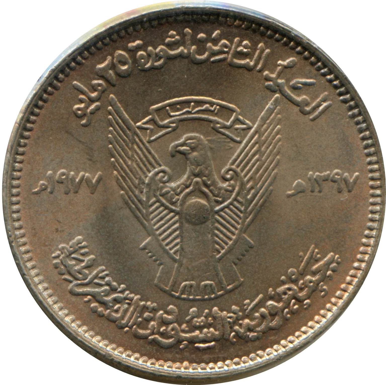 Description: Sudan's 1970–1985 emblem features a secretarybird holding a Mahdist-era shield, flanked by the dates. Scrolls above and below bear the national motto and state title. The design substitutes the common Arab eagle with this indigenous bird. The top inscription reads "Eighth Revolution May 25" with the country name below.