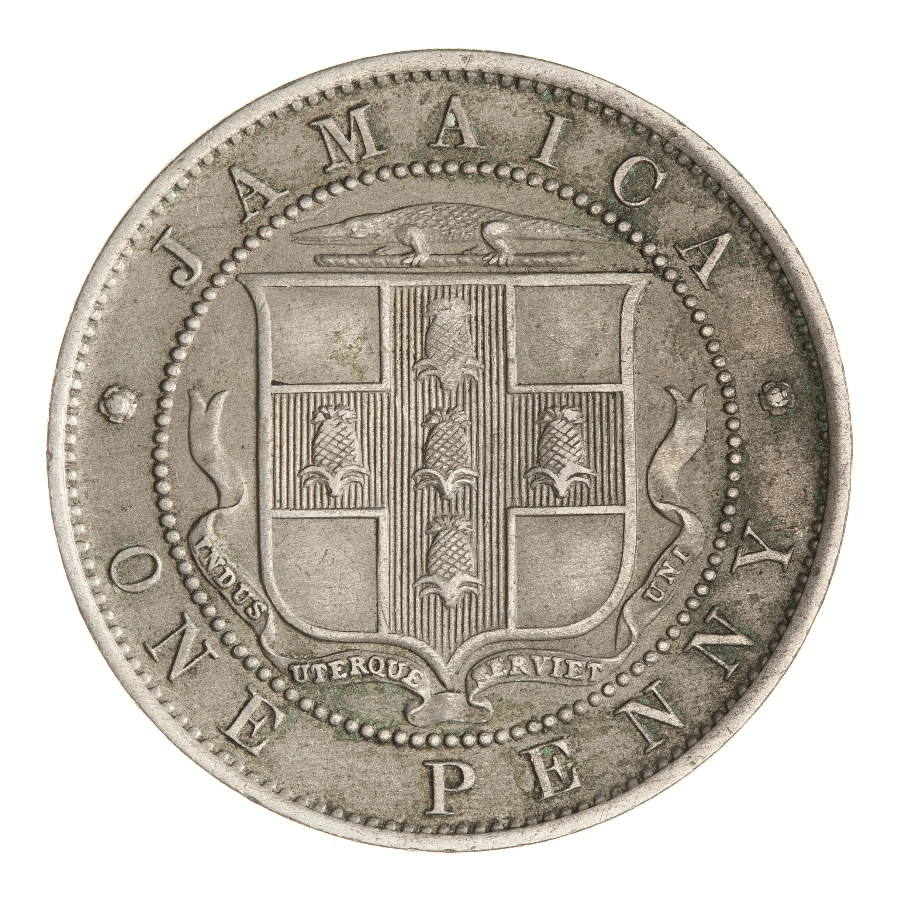 Jamaican coat of arms within a beaded circle, surrounded by legend.