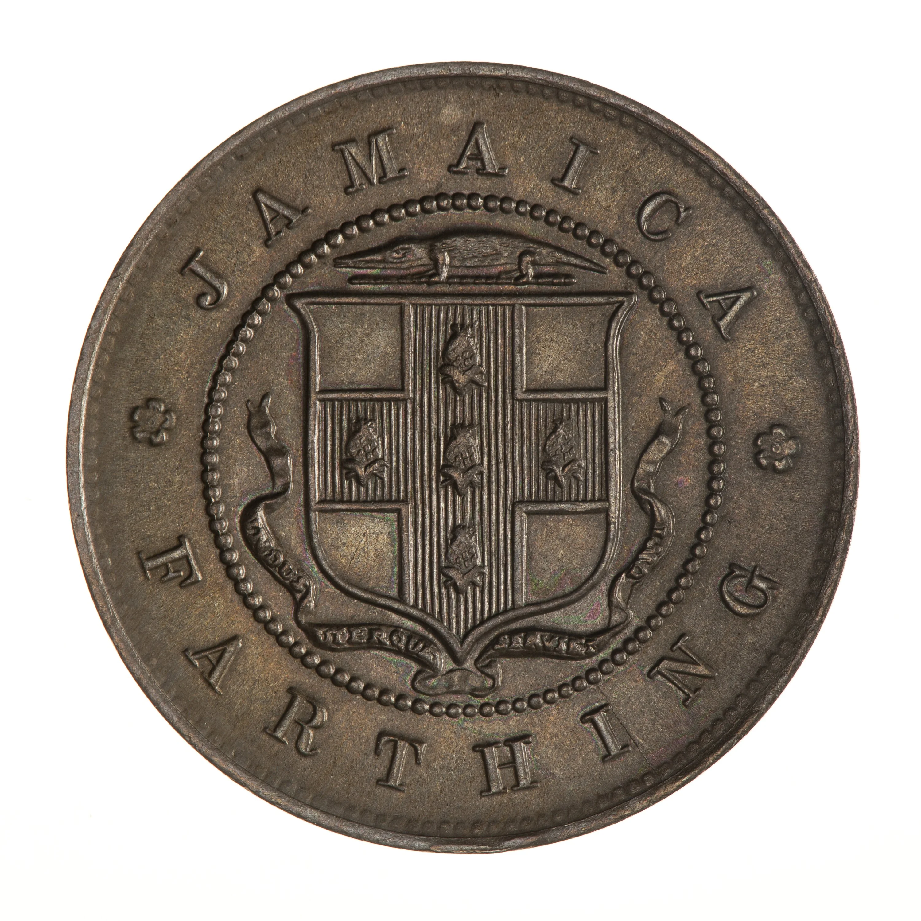 Jamaican coat of arms in beaded circle.
