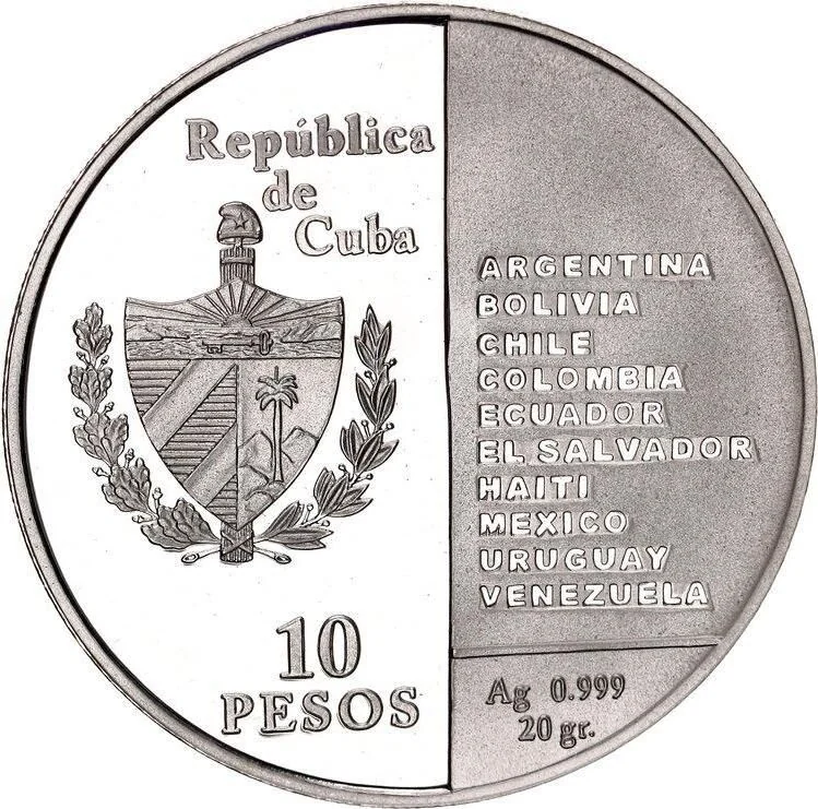 Description: Vertical split design. Left: Cuban coat of arms, country name, and face value. Right: list of 10 American nations that began independence 200 years ago. (Identical to KM# 955 & 955a).