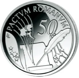 A quill pen on a document with six lines, over a map of the Union of Six. It shows "50" and "PACTUM ROMANUM," flanked by two groups of six stars.