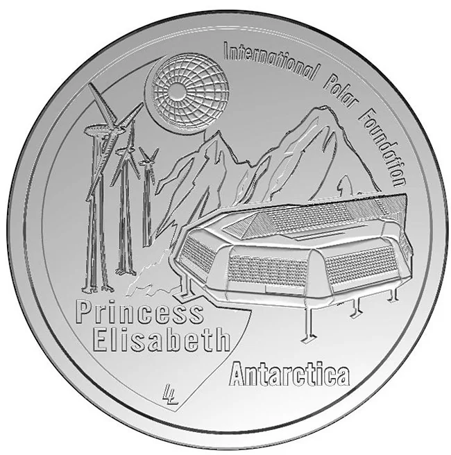 Princess Elisabeth polar station with three wind turbines, mountains, and inscriptions.