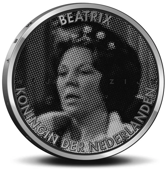 Portrait of Queen Beatrix at her coronation, composed of dots.