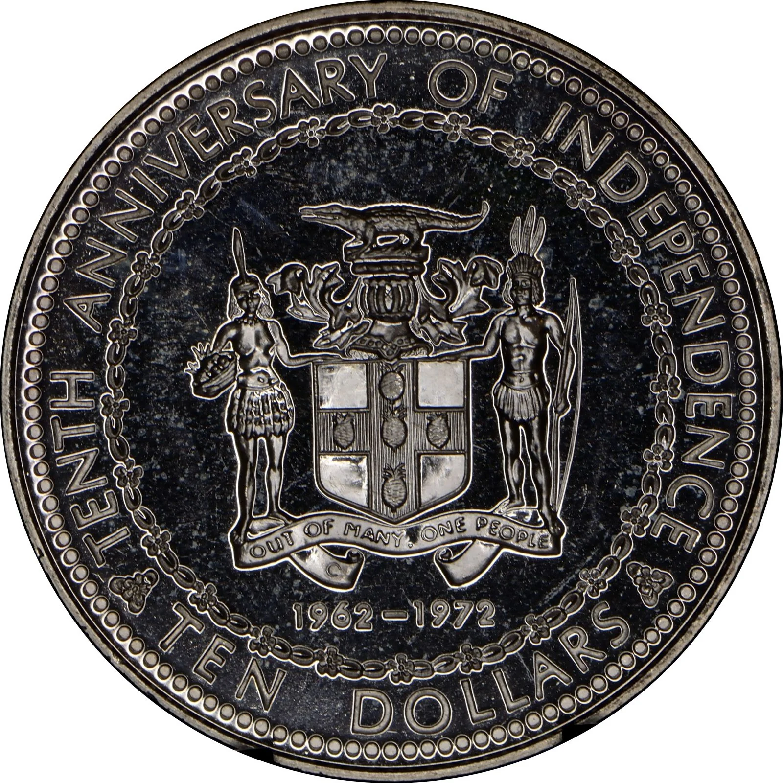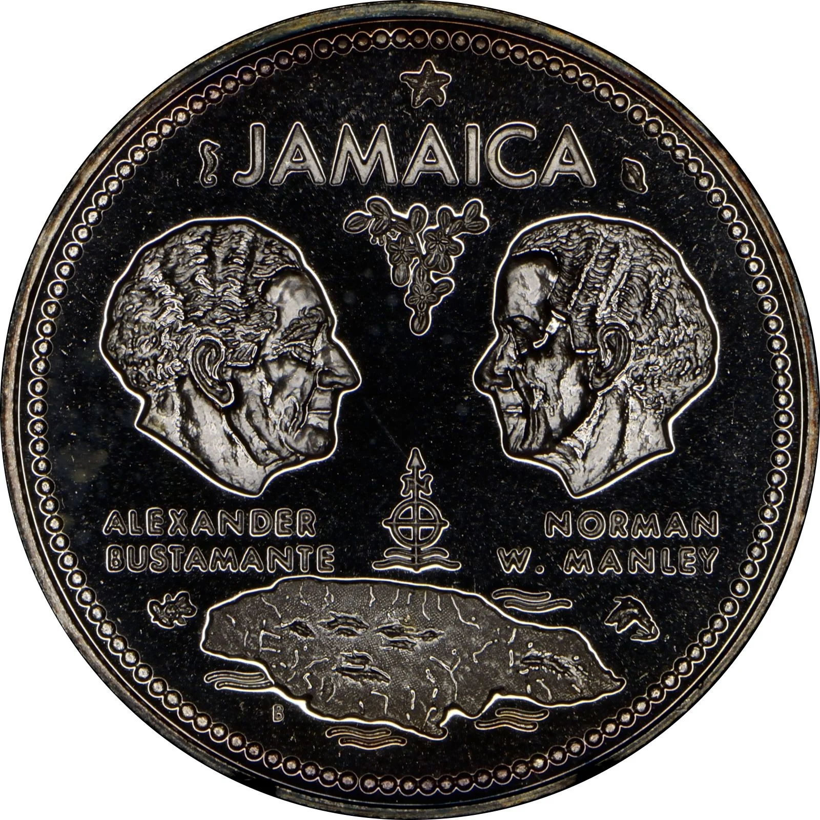 Heads of Bustamante (left) and Manley (right) flank a triangle. Stars above, map of Jamaica below.