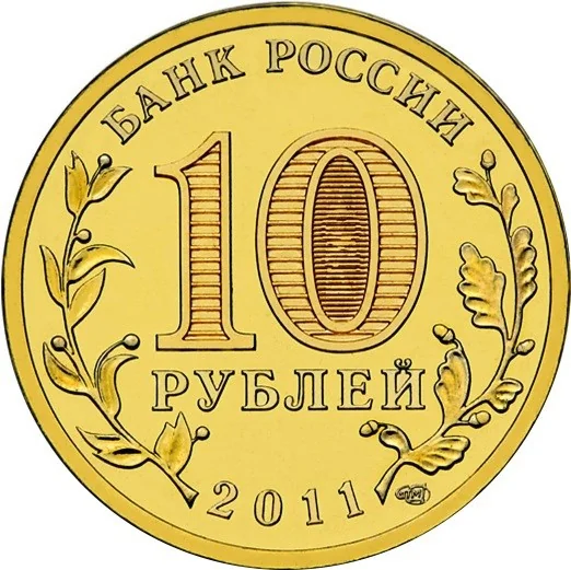 At the center, the face value "10 РУБЛЕЙ". Inside the "0", hidden images of "10" and "РУБ" appear when tilted. Around the rim: "БАНК РОССИИ" on top, "2011" on the bottom, with stylized olive and oak branches to the left and right.