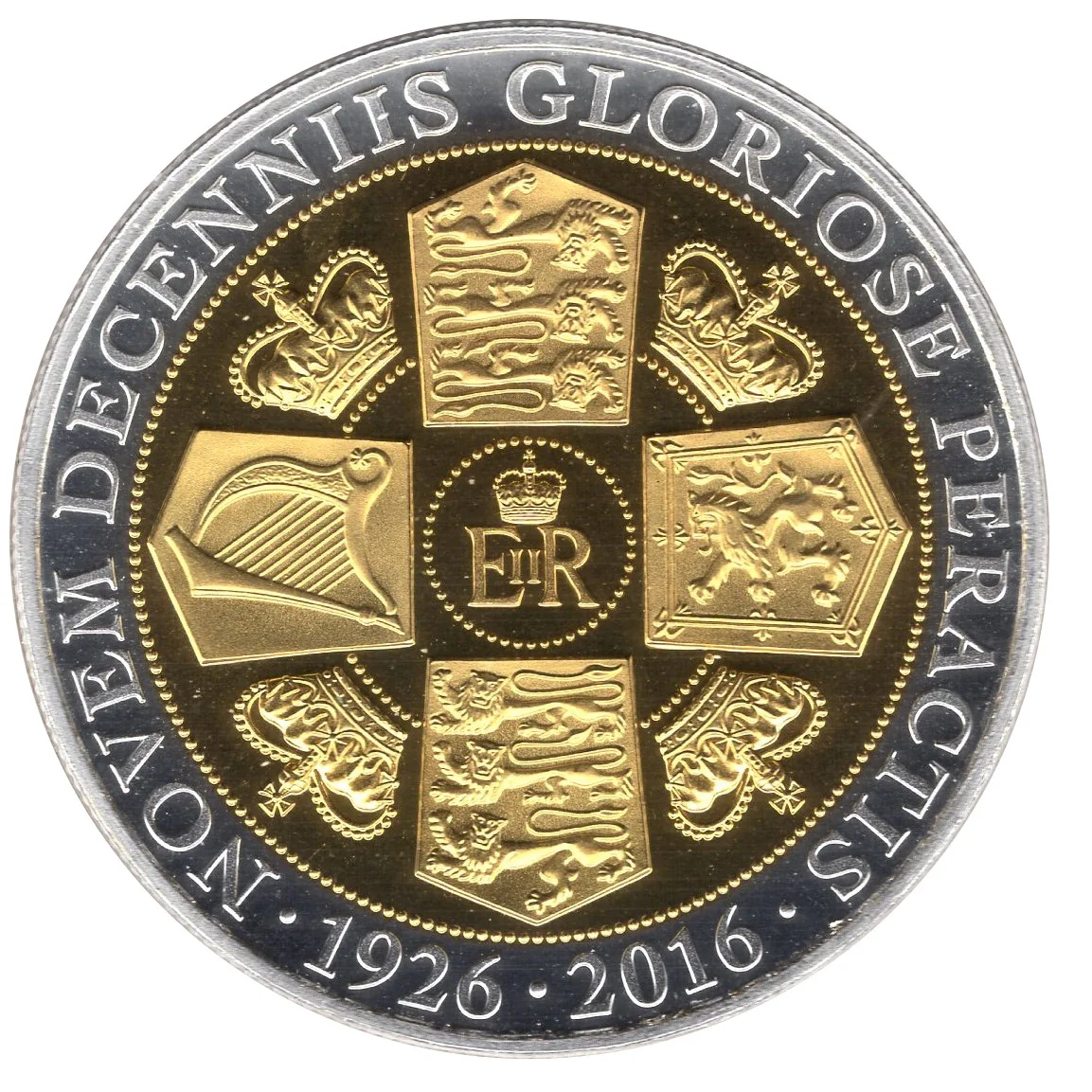 Shields of England and Wales with three lions, a Scottish lion rampant, and an Irish harp. The quadrants show St Edward's Crown encircled by a Latin inscription.
